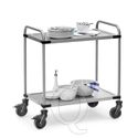 Roestvrijstalen etagewagen met twee etages en duwbeugel. Milieuvriendelijk met een lange levensduur en inzetbaar in vochtige en natte ruimten.